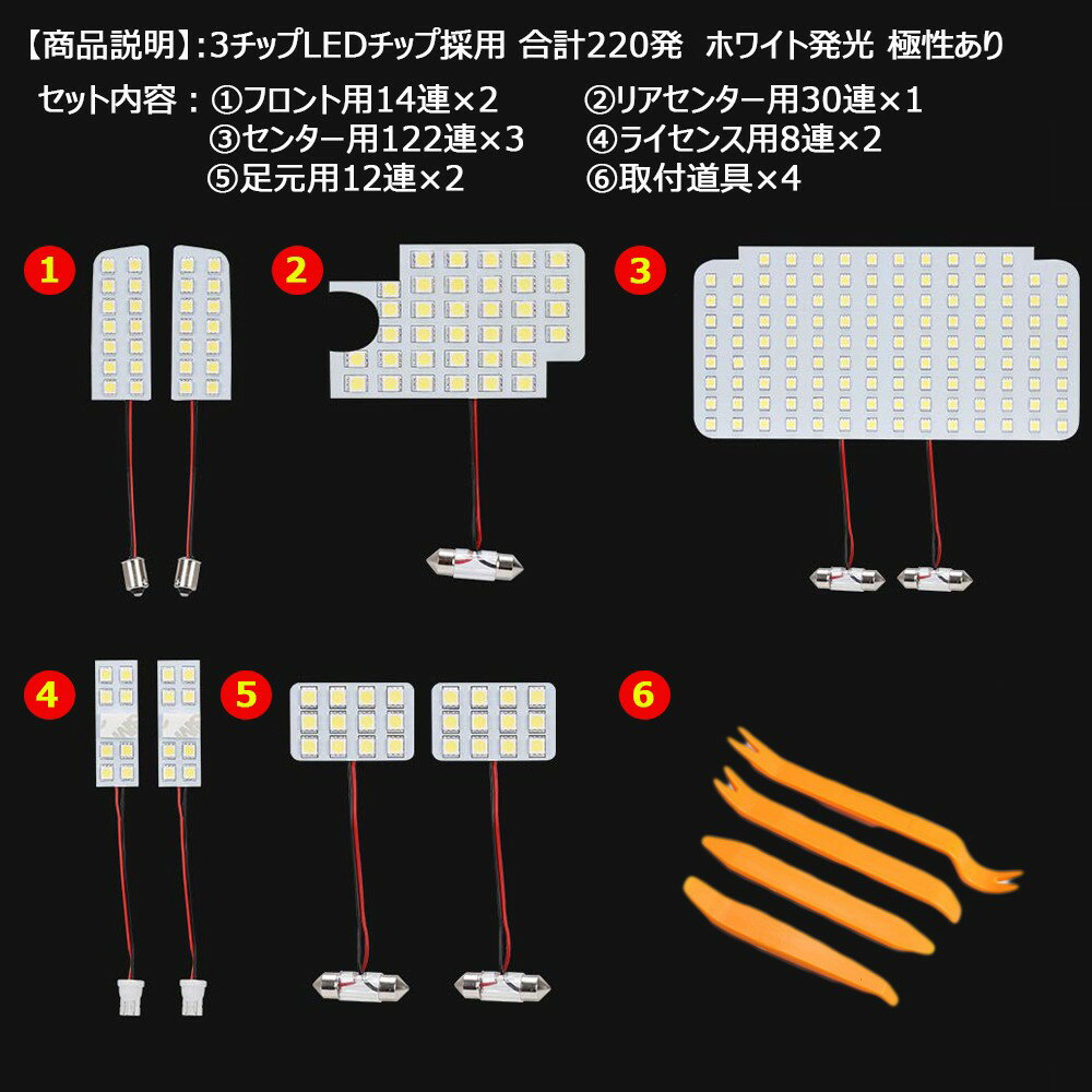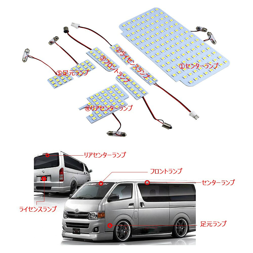 ■商品仕様 ・適合車種:トヨタ 200系ハイエース レジアスエース200系(KDH200/TRH200系) 標準 ワイドボディ 4型/5型(H25.12〜) スーパーGL専用 ・発光色:ホワイト ・色温度:6000K ・LEDチップ:高輝度3チップSMD採用(合計220連) ・使用寿命:30000時間以上 ・セット内容:・フロントランプ×2 ・センターランプ×1 ・リアセンターランプ×1 ・足元ランプ×2 ・ライセンスランプ×2 ・取付道具1セット(4種類) ※取り扱い説明書は付属しておりません (取付に関して商品説明写真をご確認をお願い致します) 保証について 初期不良保証到着1週間となります。